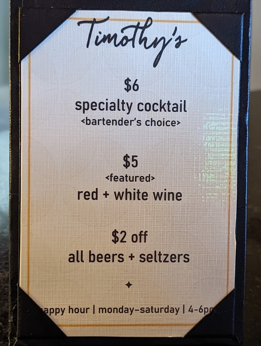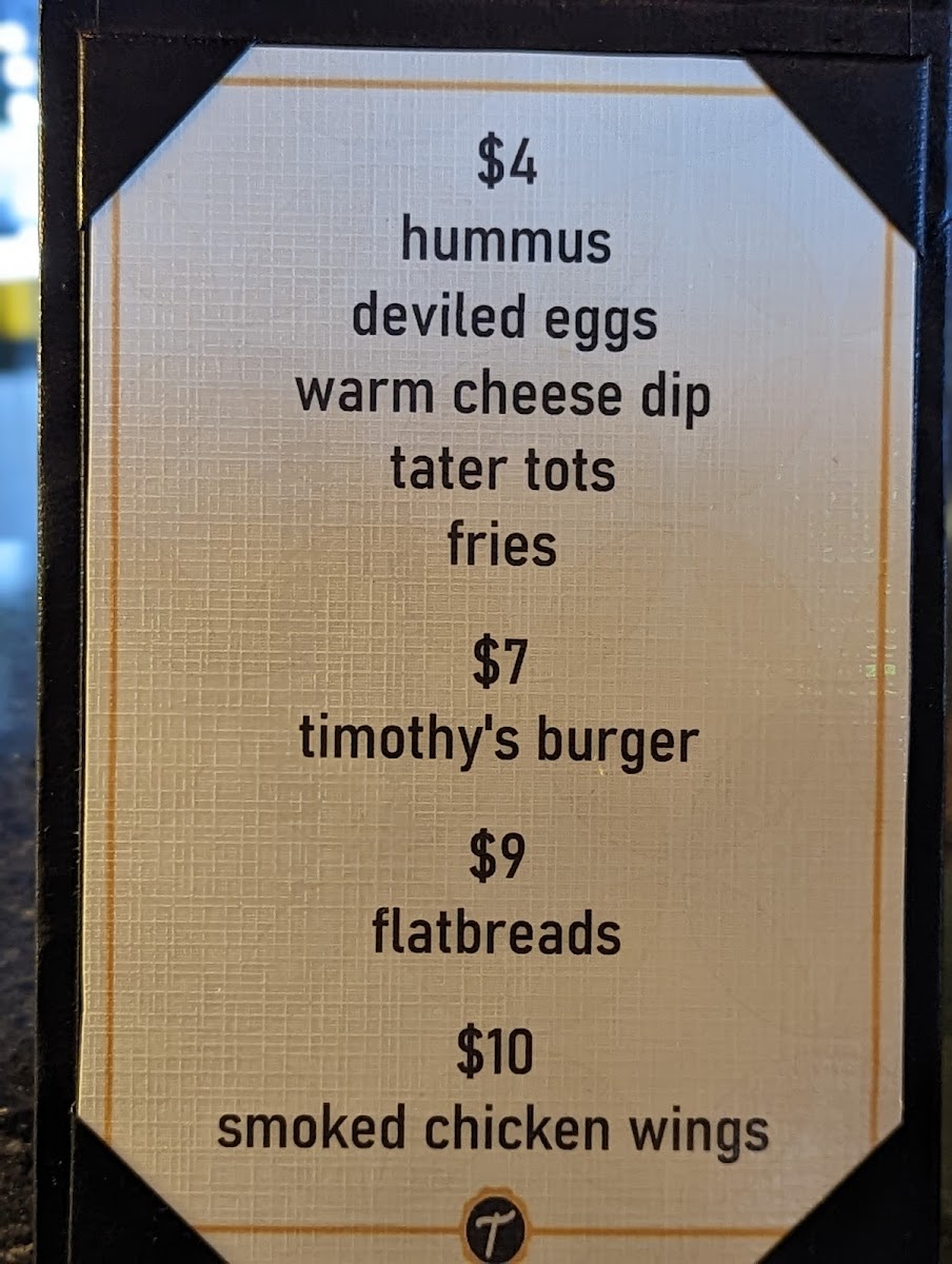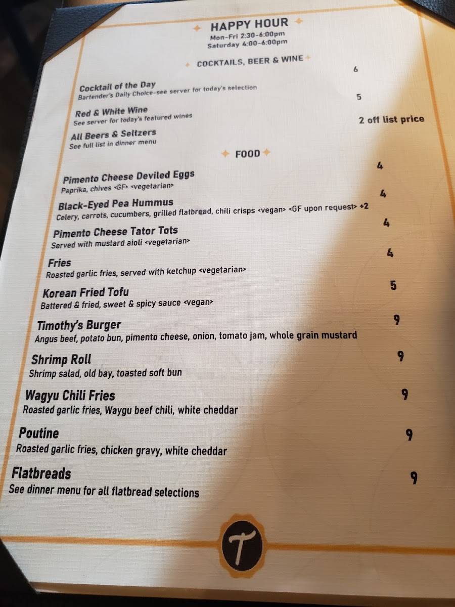 For lunch, the menu offers lighter options like Black Eyed Peas Hummus and Pimento Cheese Deviled Eggs, while the Caesar Salad and Chef Salad are excellent choices for those seeking something fresh. If you're in the mood for a main dish, try the Fish and Chips, the satisfying Timothy’s Burger and Fries, or the flavorful Turkey Club.